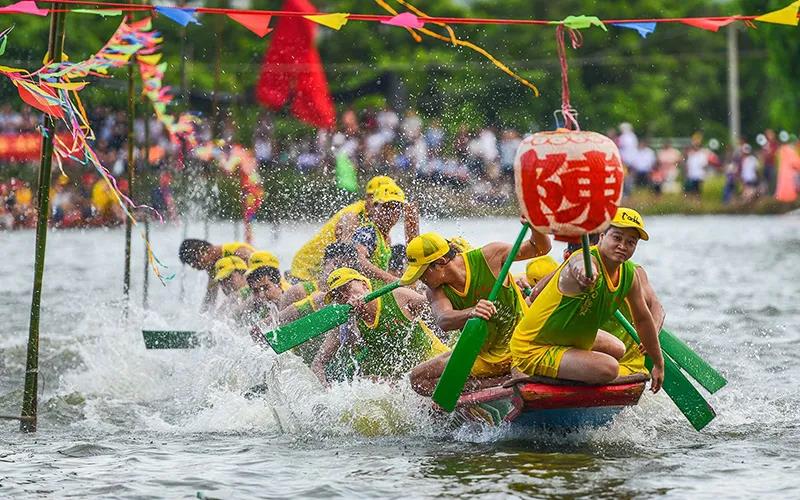 賽龍舟是端午節(jié)的主要習(xí)俗。相傳起源于古時楚國人因舍不得賢臣屈原投江死去,許多人劃船追趕拯救,他們爭先恐后,追至洞庭湖時不見蹤跡,之后每年五月五日劃龍舟以紀(jì)念之,相傳劃龍舟是為了驅(qū)散江中之魚,以免魚吃掉屈原的身體。