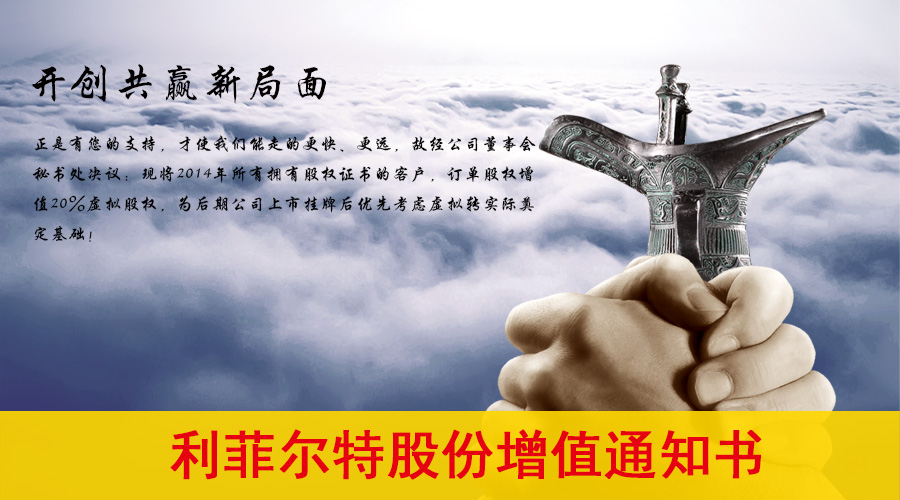 正是有您的支持,才使我們能走的更快、更遠(yuǎn),故經(jīng)公司董事會(huì)秘書處決議:現(xiàn)將2014年所有擁有股權(quán)證書的客戶,訂單股權(quán)增值20%虛擬股權(quán),為后期公司上市掛牌后優(yōu)先考慮虛擬轉(zhuǎn)實(shí)際奠定基礎(chǔ),同時(shí)2016年,我司正籌備建立新的十萬級(jí)清潔房、以及結(jié)合校企聯(lián)合新研發(fā)的在線監(jiān)測(cè)設(shè)備即將投入運(yùn)行,為利菲爾特ldquo;芯rdquo;保駕護(hù)航!