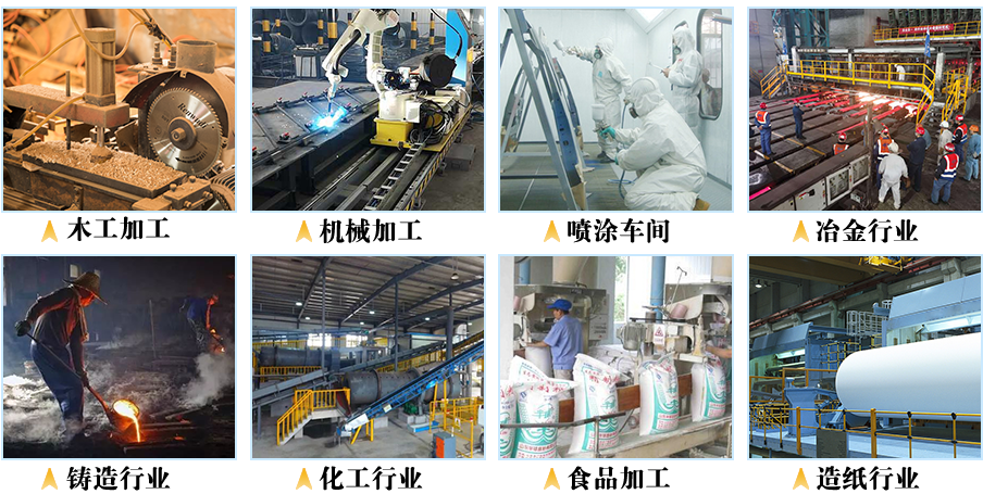 焊接、顏料、塑料、電子、輪胎、鋼板預(yù)處理、粉煤灰、陶瓷、煉化、橡膠、水泥、鈦白粉、倉(cāng)頂物料等揚(yáng)塵場(chǎng)合。