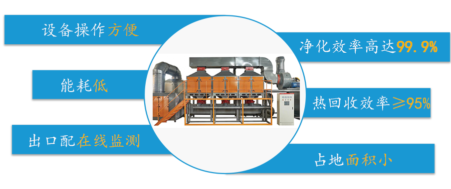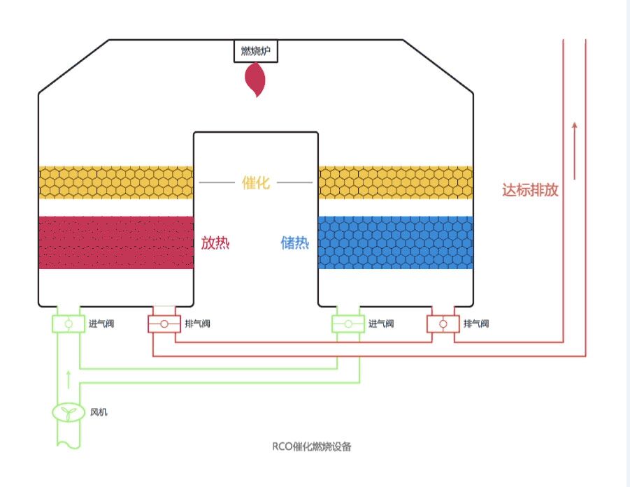 在工業(yè)生產(chǎn)過程中,排放的有機尾氣通過引風機進入設(shè)備的旋轉(zhuǎn)閥,通過選轉(zhuǎn)閥將進口氣體和出口氣體完全分開。氣體首先通過陶瓷材料填充層(底層)預熱后發(fā)生熱量的儲備和熱交換,其溫度幾乎達到催化層(中層)進行催化氧化所設(shè)定的溫度,這時其中部分污染物氧化分解;廢氣繼續(xù)通過加熱區(qū)(上層,可采用電加熱方式或天然氣加熱方式)升溫,并維持在設(shè)定溫度;其再進入催化層完成催化氧化反應,即反應生成CO2和H2O,并釋放大量的熱量,以達到預期的處理效果。